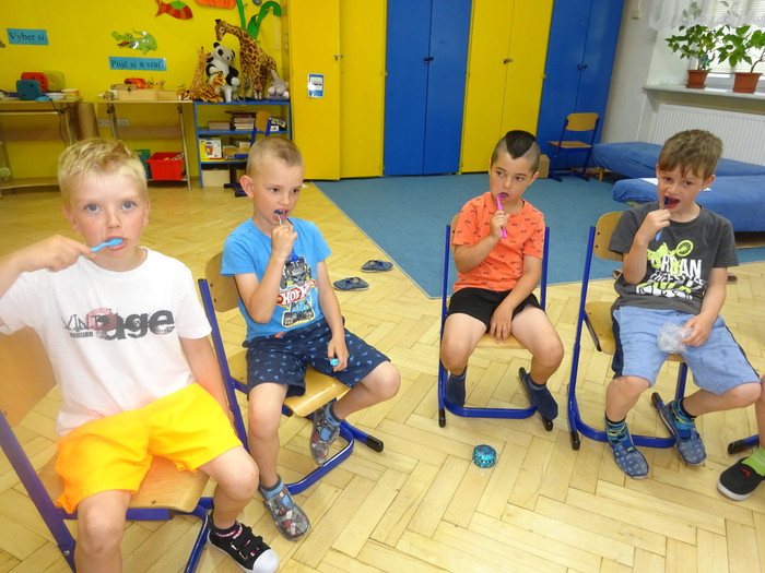 V úterý jsme si s dětmi udělali zoubkový den. Hurvínek s Máničkou nám vysvětlili, proč je důležité starat se o zoubky, jak si je správně čistit a spoustu zajímavých věcí, které se zoubků týkají. Pak nás čekaly úkoly, křížovky, kvízy…..a nakonec jsme si správné čištění zoubků vyzkoušeli naostro. Děti si domů odnesly taštičku se správnou „výbavou“ k ústní hygieně.